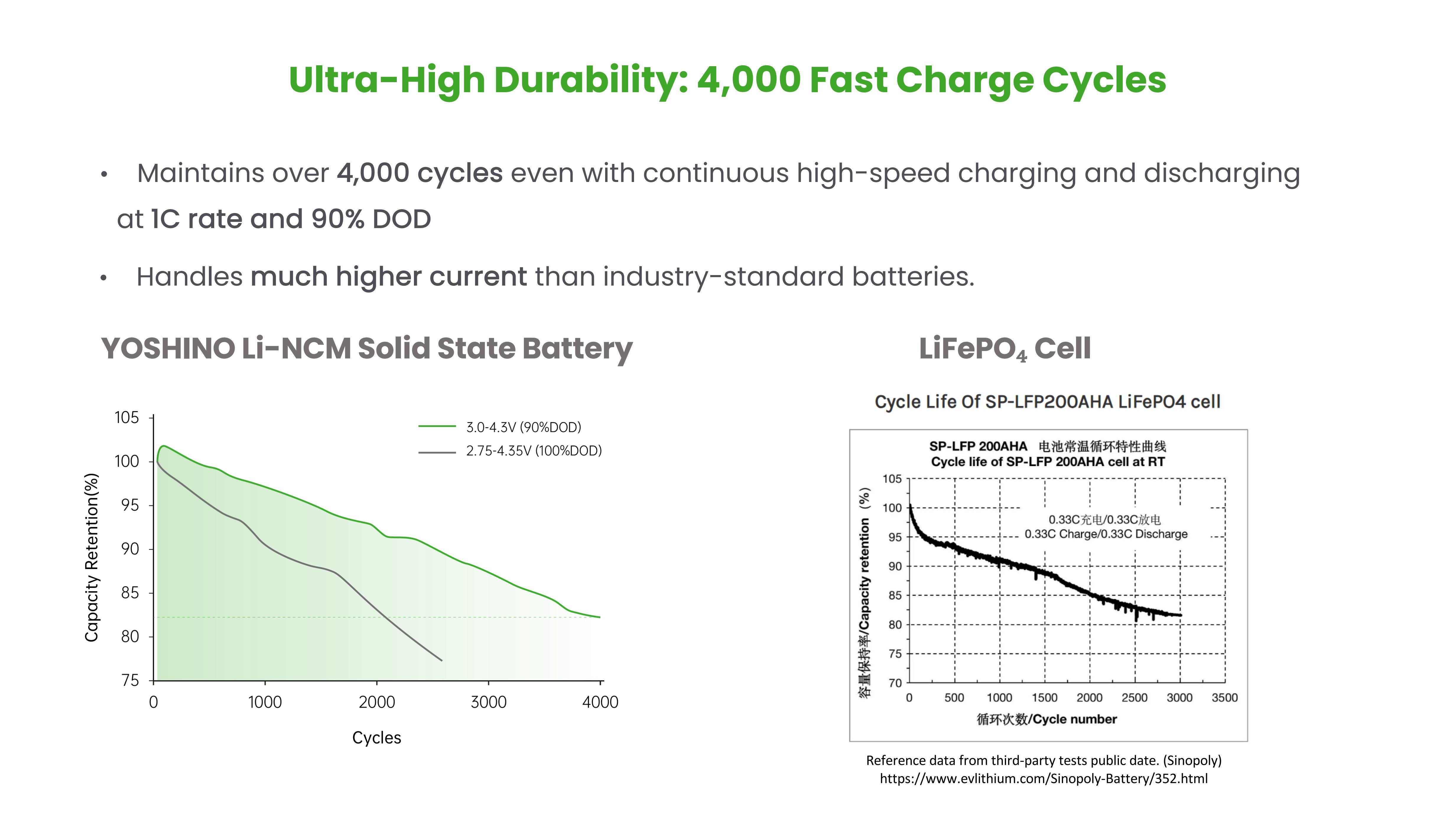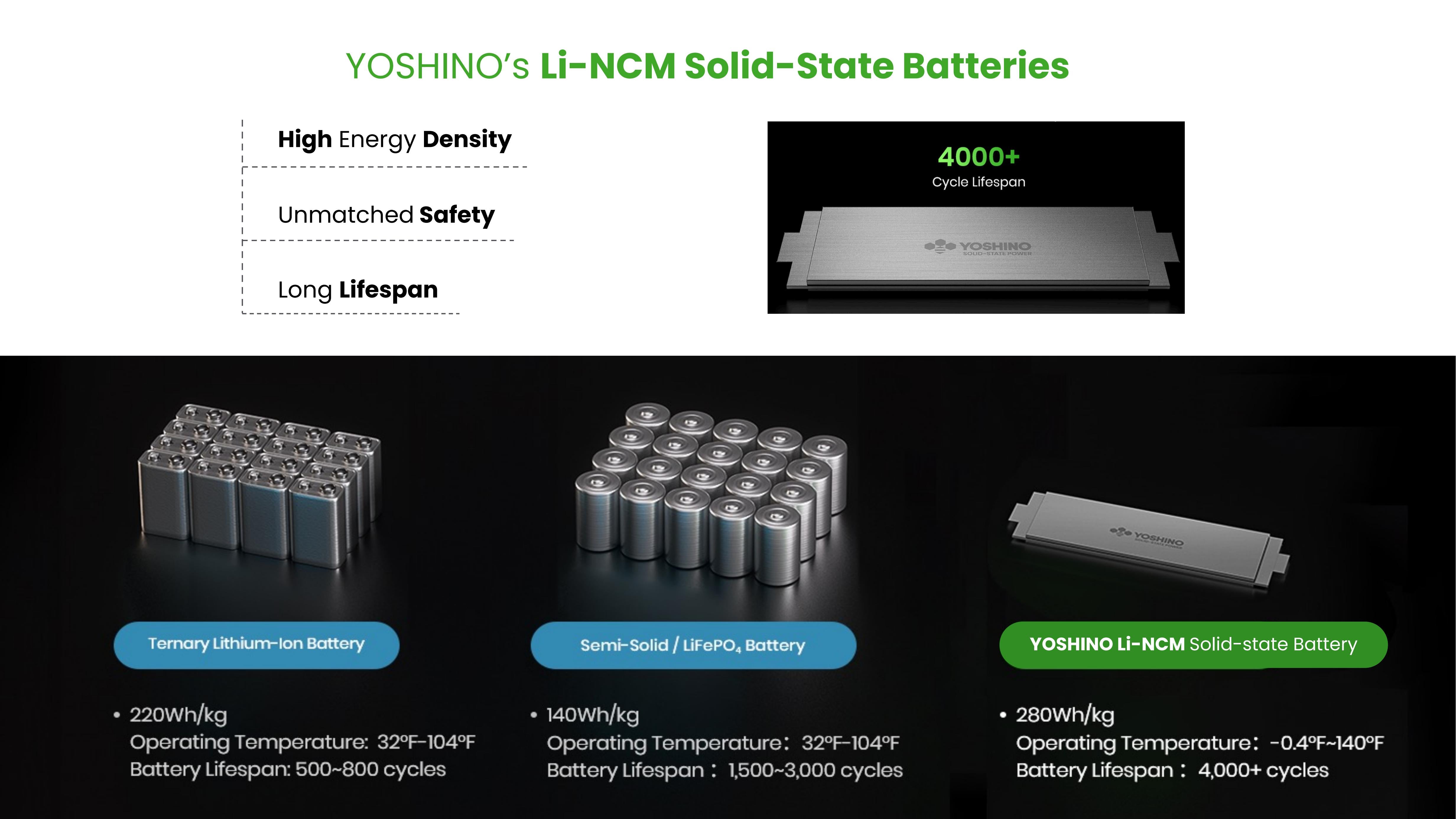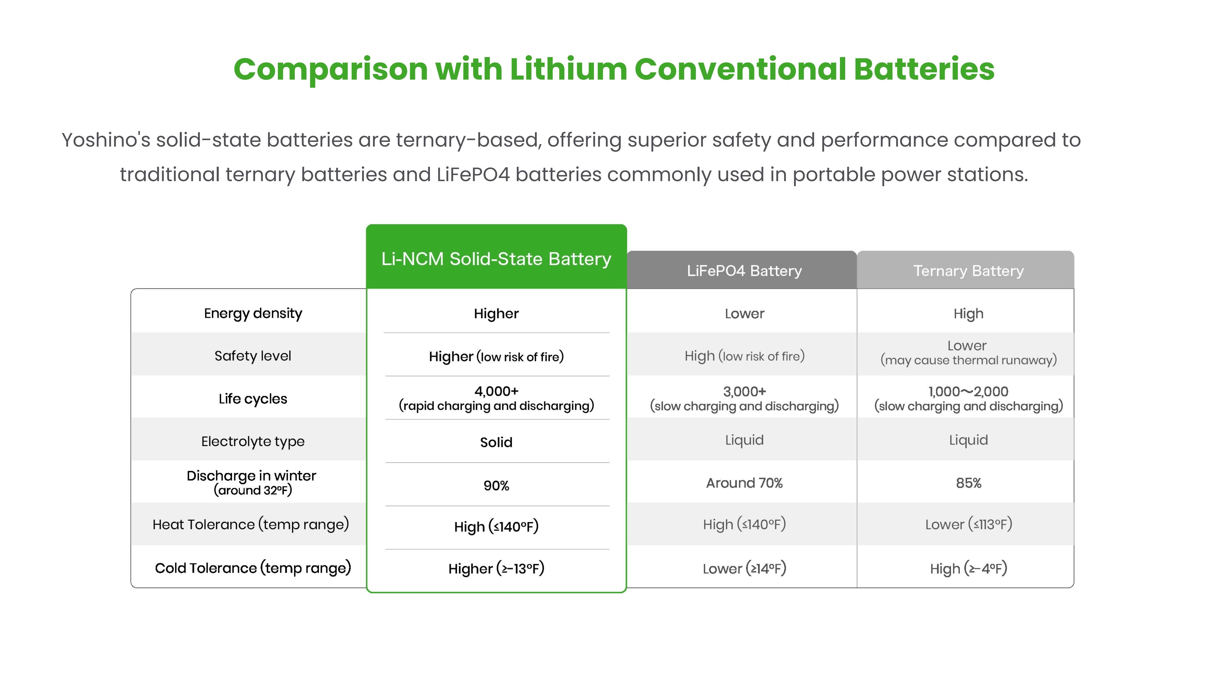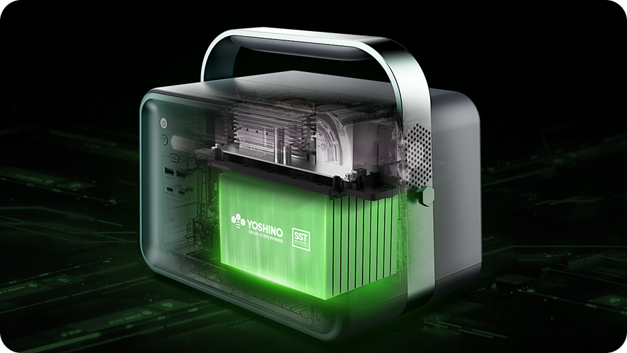 All Yoshino power stations use Li-NCM solid-state battery cells with an Inorganic Polymer Composite electrolyte featuring LATP(Lithium Aluminum Titanium Phosphate), a high-performance solid-state material. Yoshino is the only brand currently offering portable power stations that meet the scientific definition of true solid-state.
